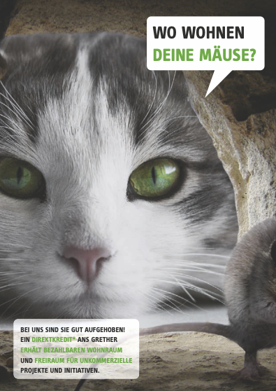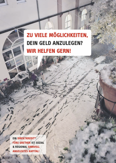 Als Ausweg bietet sich eine Art Abkürzung an, der Direktkredit. Sie können einen Teil Ihrer Ersparnisse direkt bei den drei nach Himmelsrichtungen benannten Hausprojekten des Grethergeländes anlegen – ohne Umweg über eine Bank, die ihre Kosten und ihren Gewinn bezahlt haben will. Eine ausreichende Zahl von zinsgünstigen Direktkrediten hält die Mieten auf erträglichem Niveau. Außerdem erkennt unsere Hausbank GLS Direktkredite als Eigenkapitalersatz an.